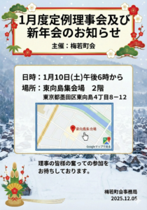 お知らせ 事務局 1月度定例理事会及び新年会のお知らせ wpmaster 2025年12月6日 1分で読めます 20251206095801 About The Author wpmaster See author's posts FacebookXHatenaCopy Post navigation Previous: 梅若町会慶弔金規定 コメントを残す コメントをキャンセルコメントを投稿するにはログインしてください。