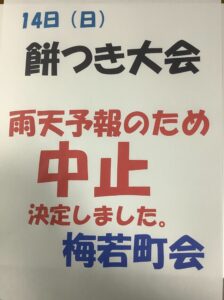 14日(日)に開催を予定しておりました「餅つき大会」ですが、**雨天の予報**が出ており、参加される皆様の安全を最優先に考えた結果、誠に残念ながら**中止**とさせていただきます。