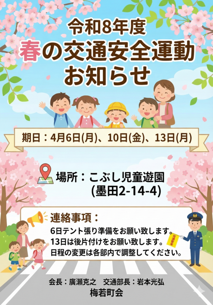 お知らせ 交通部 令和8年度春の交通安全運動のお知らせ wpmaster 2026年3月7日 0 20260307164437 About The Author wpmaster See author's posts FacebookXHatenaCopy 投稿ナビゲーション 前: ほんの少しで変わる 100年の元気習慣 コメントを残す コメントをキャンセルコメントを投稿するにはログインしてください。