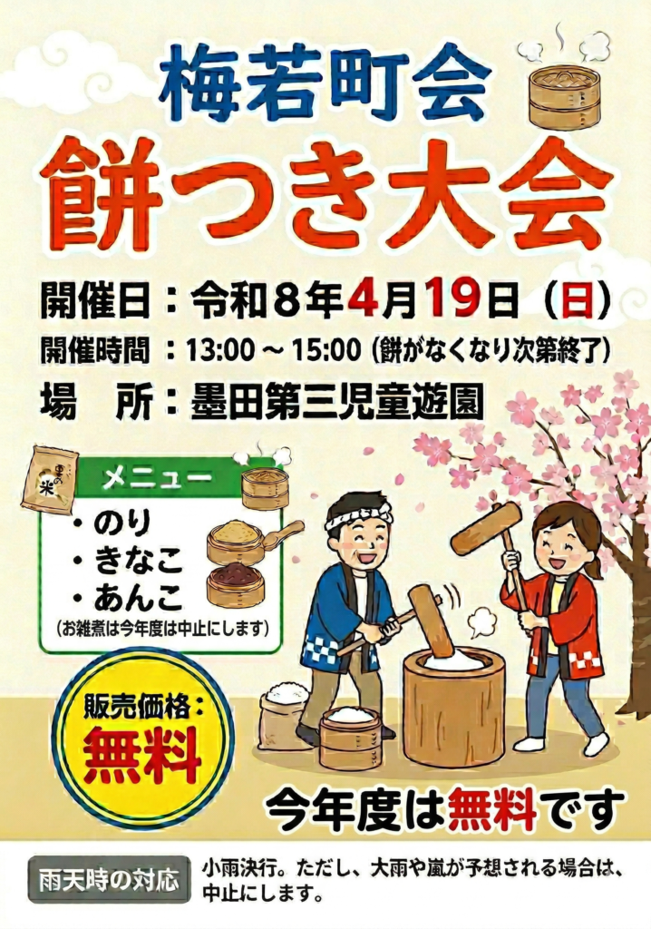 お知らせ 文化部 青少年部 令和8年4月餅つき大会のお知らせ wpmaster 2026年4月7日 0 20260407112022 About The Author wpmaster See author's posts FacebookXHatenaCopy 投稿ナビゲーション 前: 令和7年度 防災訓練-2026/03/29 コメントを残す コメントをキャンセルコメントを投稿するにはログインしてください。